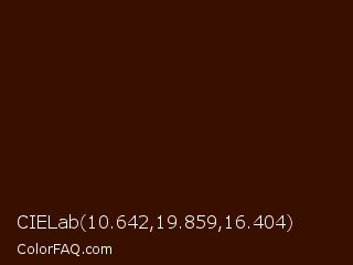 CIELab 10.642,19.859,16.404 Color is a very dark orange color and the nearest color is Bean #3d0c02. Hex code #390f00 and RGB value is rgb(57,15,0). In RGB color space, this color is composed of 22% red, 6% green, 0% blue, In CMYK color space, this color is composed of 0% cyan, 74% magenta, 100% yellow , 78% black , In HSL color space, this color has a hue angle of 16° , 100% saturation and 11% lightness.