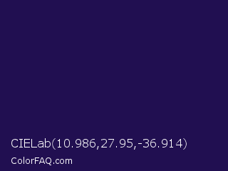 CIELab 10.986,27.95,-36.914 Color is a very dark indigo color and the nearest color is Valhalla #2b194f. Hex code #210f51 and RGB value is rgb(33,15,81). In RGB color space, this color is composed of 13% red, 6% green, 32% blue, In CMYK color space, this color is composed of 59% cyan, 81% magenta, 0% yellow , 68% black , In HSL color space, this color has a hue angle of 256° , 69% saturation and 19% lightness.