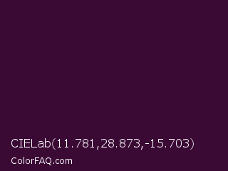 CIELab 11.781,28.873,-15.703 Color is a very dark magenta color and the nearest color is Mardi Gras #350036. Hex code #3a0a35 and RGB value is rgb(58,10,53). In RGB color space, this color is composed of 23% red, 4% green, 21% blue, In CMYK color space, this color is composed of 0% cyan, 83% magenta, 9% yellow , 77% black , In HSL color space, this color has a hue angle of 306° , 71% saturation and 13% lightness.
