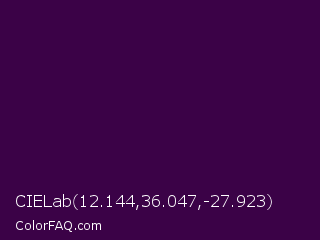 CIELab 12.144,36.047,-27.923 Color is a very dark purple color and the nearest color is Valentino #350e42. Hex code #3b0247 and RGB value is rgb(59,2,71). In RGB color space, this color is composed of 23% red, 1% green, 28% blue, In CMYK color space, this color is composed of 17% cyan, 97% magenta, 0% yellow , 72% black , In HSL color space, this color has a hue angle of 290° , 95% saturation and 14% lightness.