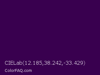 CIELab 12.185,38.242,-33.429 Color is a very dark purple color and the nearest color is Ripe Plum #410056. Hex code #39004f and RGB value is rgb(57,0,79). In RGB color space, this color is composed of 22% red, 0% green, 31% blue, In CMYK color space, this color is composed of 28% cyan, 100% magenta, 0% yellow , 69% black , In HSL color space, this color has a hue angle of 283° , 100% saturation and 15% lightness.