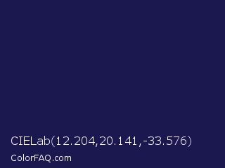 CIELab 12.204,20.141,-33.576 Color is a very dark indigo color and the nearest color is Bunting #151f4c. Hex code #1a184f and RGB value is rgb(26,24,79). In RGB color space, this color is composed of 10% red, 9% green, 31% blue, In CMYK color space, this color is composed of 67% cyan, 70% magenta, 0% yellow , 69% black , In HSL color space, this color has a hue angle of 242° , 53% saturation and 20% lightness.