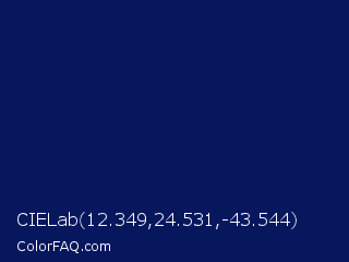 CIELab 12.349,24.531,-43.544 Color is a very dark blue color and the nearest color is Gulf Blue #051657. Hex code #06175e and RGB value is rgb(6,23,94). In RGB color space, this color is composed of 2% red, 9% green, 37% blue, In CMYK color space, this color is composed of 94% cyan, 76% magenta, 0% yellow , 63% black , In HSL color space, this color has a hue angle of 228° , 88% saturation and 20% lightness.