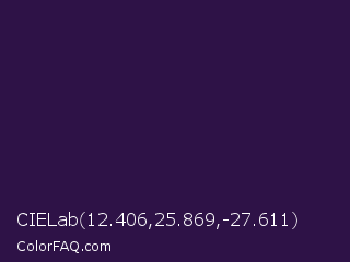 CIELab 12.406,25.869,-27.611 Color is a very dark purple color and the nearest color is Russian Violet #32174d. Hex code #2e1247 and RGB value is rgb(46,18,71). In RGB color space, this color is composed of 18% red, 7% green, 28% blue, In CMYK color space, this color is composed of 35% cyan, 75% magenta, 0% yellow , 72% black , In HSL color space, this color has a hue angle of 272° , 60% saturation and 17% lightness.