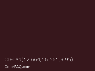 CIELab 12.664,16.561,3.95 Color is a very dark red color and the nearest color is Tamarind #341515. Hex code #37171c and RGB value is rgb(55,23,28). In RGB color space, this color is composed of 22% red, 9% green, 11% blue, In CMYK color space, this color is composed of 0% cyan, 58% magenta, 49% yellow , 78% black , In HSL color space, this color has a hue angle of 351° , 41% saturation and 15% lightness.