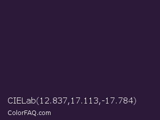 CIELab 12.837,17.113,-17.784 Color is a very dark purple color and the nearest color is Dark Purple #301934. Hex code #2c193a and RGB value is rgb(44,25,58). In RGB color space, this color is composed of 17% red, 10% green, 23% blue, In CMYK color space, this color is composed of 24% cyan, 57% magenta, 0% yellow , 77% black , In HSL color space, this color has a hue angle of 275° , 40% saturation and 16% lightness.