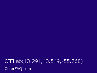 CIELab 13.291,43.549,-55.768 Color is a dark indigo color and the nearest color is Deep Blue #220878. Hex code #200373 and RGB value is rgb(32,3,115). In RGB color space, this color is composed of 13% red, 1% green, 45% blue, In CMYK color space, this color is composed of 72% cyan, 97% magenta, 0% yellow , 55% black , In HSL color space, this color has a hue angle of 256° , 95% saturation and 23% lightness.