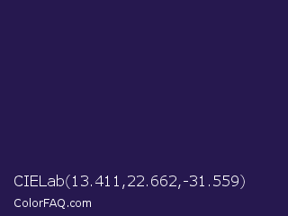 CIELab 13.411,22.662,-31.559 Color is a very dark indigo color and the nearest color is Valhalla #2b194f. Hex code #26184f and RGB value is rgb(38,24,79). In RGB color space, this color is composed of 15% red, 9% green, 31% blue, In CMYK color space, this color is composed of 52% cyan, 70% magenta, 0% yellow , 69% black , In HSL color space, this color has a hue angle of 255° , 53% saturation and 20% lightness.