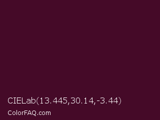 CIELab 13.445,30.14,-3.44 Color is a very dark rose color and the nearest color is Barossa #44012d. Hex code #450a28 and RGB value is rgb(69,10,40). In RGB color space, this color is composed of 27% red, 4% green, 16% blue, In CMYK color space, this color is composed of 0% cyan, 86% magenta, 42% yellow , 73% black , In HSL color space, this color has a hue angle of 329° , 75% saturation and 15% lightness.