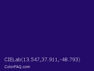 CIELab 13.547,37.911,-48.793 Color is a dark indigo color and the nearest color is Paris M #26056a. Hex code #250b69 and RGB value is rgb(37,11,105). In RGB color space, this color is composed of 15% red, 4% green, 41% blue, In CMYK color space, this color is composed of 65% cyan, 90% magenta, 0% yellow , 59% black , In HSL color space, this color has a hue angle of 257° , 81% saturation and 23% lightness.