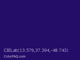 CIELab 13.579,37.394,-48.743 Color is a dark indigo color and the nearest color is Paris M #26056a. Hex code #240c69 and RGB value is rgb(36,12,105). In RGB color space, this color is composed of 14% red, 5% green, 41% blue, In CMYK color space, this color is composed of 66% cyan, 89% magenta, 0% yellow , 59% black , In HSL color space, this color has a hue angle of 255° , 79% saturation and 23% lightness.