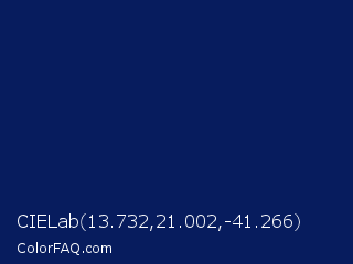 CIELab 13.732,21.002,-41.266 Color is a very dark blue color and the nearest color is Madison #09255d. Hex code #071c5e and RGB value is rgb(7,28,94). In RGB color space, this color is composed of 3% red, 11% green, 37% blue, In CMYK color space, this color is composed of 93% cyan, 70% magenta, 0% yellow , 63% black , In HSL color space, this color has a hue angle of 226° , 86% saturation and 20% lightness.