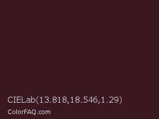 CIELab 13.818,18.546,1.29 Color is a very dark rose color and the nearest color is Jon #3b1f1f. Hex code #3b1822 and RGB value is rgb(59,24,34). In RGB color space, this color is composed of 23% red, 9% green, 13% blue, In CMYK color space, this color is composed of 0% cyan, 59% magenta, 42% yellow , 77% black , In HSL color space, this color has a hue angle of 343° , 42% saturation and 16% lightness.