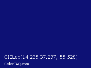 CIELab 14.235,37.237,-55.528 Color is a dark blue color and the nearest color is Arapawa #110c6c. Hex code #0d1175 and RGB value is rgb(13,17,117). In RGB color space, this color is composed of 5% red, 7% green, 46% blue, In CMYK color space, this color is composed of 89% cyan, 85% magenta, 0% yellow , 54% black , In HSL color space, this color has a hue angle of 238° , 80% saturation and 25% lightness.