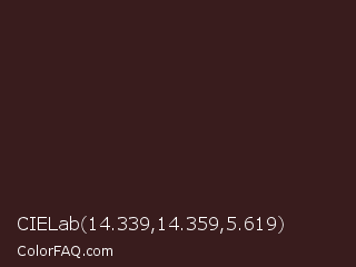 CIELab 14.339,14.359,5.619 Color is a very dark red color and the nearest color is Jon #3b1f1f. Hex code #391c1d and RGB value is rgb(57,28,29). In RGB color space, this color is composed of 22% red, 11% green, 11% blue, In CMYK color space, this color is composed of 0% cyan, 51% magenta, 49% yellow , 78% black , In HSL color space, this color has a hue angle of 358° , 34% saturation and 17% lightness.