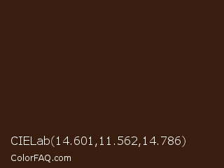 CIELab 14.601,11.562,14.786 Color is a very dark orange color and the nearest color is Sambuca #3a2010. Hex code #391e10 and RGB value is rgb(57,30,16). In RGB color space, this color is composed of 22% red, 12% green, 6% blue, In CMYK color space, this color is composed of 0% cyan, 47% magenta, 72% yellow , 78% black , In HSL color space, this color has a hue angle of 20° , 56% saturation and 14% lightness.