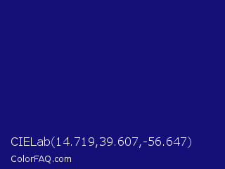 CIELab 14.719,39.607,-56.647 Color is a dark indigo color and the nearest color is Deep Koamaru #1b127b. Hex code #150f78 and RGB value is rgb(21,15,120). In RGB color space, this color is composed of 8% red, 6% green, 47% blue, In CMYK color space, this color is composed of 83% cyan, 88% magenta, 0% yellow , 53% black , In HSL color space, this color has a hue angle of 243° , 78% saturation and 26% lightness.