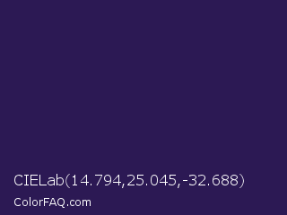 CIELab 14.794,25.045,-32.688 Color is a very dark indigo color and the nearest color is Valhalla #2b194f. Hex code #2c1954 and RGB value is rgb(44,25,84). In RGB color space, this color is composed of 17% red, 10% green, 33% blue, In CMYK color space, this color is composed of 48% cyan, 70% magenta, 0% yellow , 67% black , In HSL color space, this color has a hue angle of 259° , 54% saturation and 21% lightness.