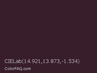 CIELab 14.921,13.873,-1.534 Color is a very dark rose color and the nearest color is Jon #3b1f1f. Hex code #371e28 and RGB value is rgb(55,30,40). In RGB color space, this color is composed of 22% red, 12% green, 16% blue, In CMYK color space, this color is composed of 0% cyan, 45% magenta, 27% yellow , 78% black , In HSL color space, this color has a hue angle of 336° , 29% saturation and 17% lightness.