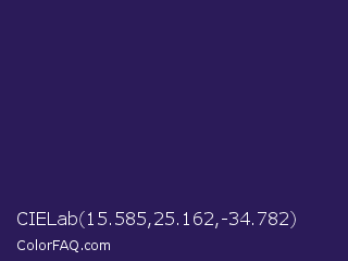 CIELab 15.585,25.162,-34.782 Color is a dark indigo color and the nearest color is Valhalla #2b194f. Hex code #2b1b59 and RGB value is rgb(43,27,89). In RGB color space, this color is composed of 17% red, 11% green, 35% blue, In CMYK color space, this color is composed of 52% cyan, 70% magenta, 0% yellow , 65% black , In HSL color space, this color has a hue angle of 255° , 53% saturation and 23% lightness.