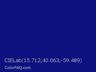 CIELab 15.712,40.063,-59.489 Color is a dark blue color and the nearest color is Dark Imperial Blue #00147e. Hex code #0c127f and RGB value is rgb(12,18,127). In RGB color space, this color is composed of 5% red, 7% green, 50% blue, In CMYK color space, this color is composed of 91% cyan, 86% magenta, 0% yellow , 50% black , In HSL color space, this color has a hue angle of 237° , 83% saturation and 27% lightness.