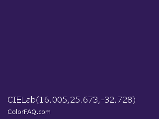 CIELab 16.005,25.673,-32.728 Color is a very dark violet color and the nearest color is Valhalla #2b194f. Hex code #301b57 and RGB value is rgb(48,27,87). In RGB color space, this color is composed of 19% red, 11% green, 34% blue, In CMYK color space, this color is composed of 45% cyan, 69% magenta, 0% yellow , 66% black , In HSL color space, this color has a hue angle of 261° , 53% saturation and 22% lightness.