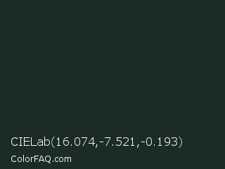 CIELab 16.074,-7.521,-0.193 Color is a very dark cyan color and the nearest color is Dark Gunmetal #1f262a. Hex code #1b2b28 and RGB value is rgb(27,43,40). In RGB color space, this color is composed of 11% red, 17% green, 16% blue, In CMYK color space, this color is composed of 37% cyan, 0% magenta, 7% yellow , 83% black , In HSL color space, this color has a hue angle of 169° , 23% saturation and 14% lightness.