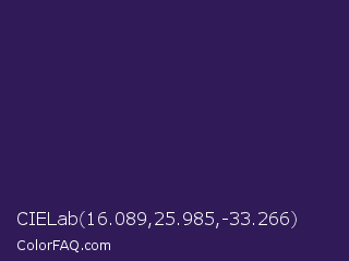 CIELab 16.089,25.985,-33.266 Color is a dark violet color and the nearest color is Valhalla #2b194f. Hex code #301b58 and RGB value is rgb(48,27,88). In RGB color space, this color is composed of 19% red, 11% green, 35% blue, In CMYK color space, this color is composed of 45% cyan, 69% magenta, 0% yellow , 65% black , In HSL color space, this color has a hue angle of 261° , 53% saturation and 23% lightness.