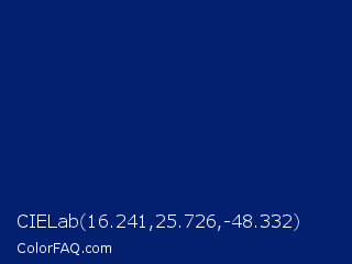 CIELab 16.241,25.726,-48.332 Color is a very dark blue color and the nearest color is Royal Blue #002366. Hex code #031f6f and RGB value is rgb(3,31,111). In RGB color space, this color is composed of 1% red, 12% green, 44% blue, In CMYK color space, this color is composed of 97% cyan, 72% magenta, 0% yellow , 56% black , In HSL color space, this color has a hue angle of 224° , 95% saturation and 22% lightness.