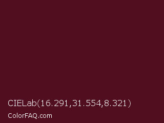 CIELab 16.291,31.554,8.321 Color is a very dark red color and the nearest color is Maroon Oak #520c17. Hex code #510e1e and RGB value is rgb(81,14,30). In RGB color space, this color is composed of 32% red, 5% green, 12% blue, In CMYK color space, this color is composed of 0% cyan, 83% magenta, 63% yellow , 68% black , In HSL color space, this color has a hue angle of 346° , 71% saturation and 19% lightness.