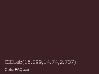 CIELab 16.299,14.74,2.737 Color is a very dark red color and the nearest color is Jon #3b1f1f. Hex code #3d2025 and RGB value is rgb(61,32,37). In RGB color space, this color is composed of 24% red, 13% green, 15% blue, In CMYK color space, this color is composed of 0% cyan, 48% magenta, 39% yellow , 76% black , In HSL color space, this color has a hue angle of 350° , 31% saturation and 18% lightness.