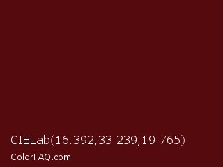 CIELab 16.392,33.239,19.765 Color is a very dark red color and the nearest color is Heath #541012. Hex code #550a0d and RGB value is rgb(85,10,13). In RGB color space, this color is composed of 33% red, 4% green, 5% blue, In CMYK color space, this color is composed of 0% cyan, 88% magenta, 85% yellow , 67% black , In HSL color space, this color has a hue angle of 358° , 79% saturation and 19% lightness.