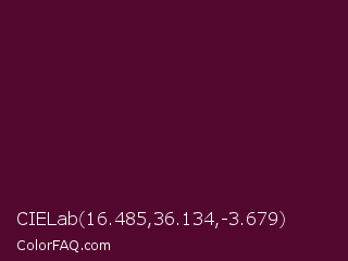 CIELab 16.485,36.134,-3.679 Color is a very dark rose color and the nearest color is Blackberry #4d0135. Hex code #53072f and RGB value is rgb(83,7,47). In RGB color space, this color is composed of 33% red, 3% green, 18% blue, In CMYK color space, this color is composed of 0% cyan, 92% magenta, 43% yellow , 67% black , In HSL color space, this color has a hue angle of 328° , 84% saturation and 18% lightness.