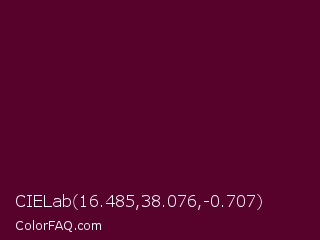 CIELab 16.485,38.076,-0.707 Color is a very dark rose color and the nearest color is Bordeaux #5c0120. Hex code #56022b and RGB value is rgb(86,2,43). In RGB color space, this color is composed of 34% red, 1% green, 17% blue, In CMYK color space, this color is composed of 0% cyan, 98% magenta, 50% yellow , 66% black , In HSL color space, this color has a hue angle of 331° , 95% saturation and 17% lightness.