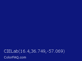 CIELab 16.4,36.749,-57.069 Color is a dark blue color and the nearest color is Dark Imperial Blue #00147e. Hex code #0d177d and RGB value is rgb(13,23,125). In RGB color space, this color is composed of 5% red, 9% green, 49% blue, In CMYK color space, this color is composed of 90% cyan, 82% magenta, 0% yellow , 51% black , In HSL color space, this color has a hue angle of 235° , 81% saturation and 27% lightness.