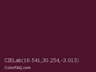 CIELab 16.541,30.254,-3.013 Color is a very dark rose color and the nearest color is Wine Berry #591d35. Hex code #4d122e and RGB value is rgb(77,18,46). In RGB color space, this color is composed of 30% red, 7% green, 18% blue, In CMYK color space, this color is composed of 0% cyan, 77% magenta, 40% yellow , 70% black , In HSL color space, this color has a hue angle of 332° , 62% saturation and 19% lightness.