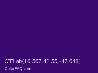CIELab 16.567,42.55,-47.648 Color is a dark violet color and the nearest color is Blue Diamond #380474. Hex code #39096f and RGB value is rgb(57,9,111). In RGB color space, this color is composed of 22% red, 4% green, 44% blue, In CMYK color space, this color is composed of 49% cyan, 92% magenta, 0% yellow , 56% black , In HSL color space, this color has a hue angle of 268° , 85% saturation and 24% lightness.
