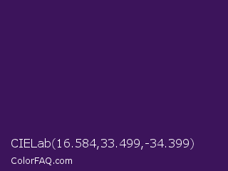 CIELab 16.584,33.499,-34.399 Color is a very dark purple color and the nearest color is Scarlet Gum #431560. Hex code #3c145b and RGB value is rgb(60,20,91). In RGB color space, this color is composed of 24% red, 8% green, 36% blue, In CMYK color space, this color is composed of 34% cyan, 78% magenta, 0% yellow , 64% black , In HSL color space, this color has a hue angle of 274° , 64% saturation and 22% lightness.