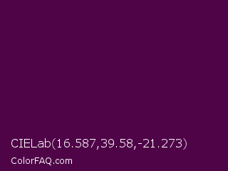 CIELab 16.587,39.58,-21.273 Color is a very dark magenta color and the nearest color is Loulou #460b41. Hex code #4f0448 and RGB value is rgb(79,4,72). In RGB color space, this color is composed of 31% red, 2% green, 28% blue, In CMYK color space, this color is composed of 0% cyan, 95% magenta, 9% yellow , 69% black , In HSL color space, this color has a hue angle of 306° , 90% saturation and 16% lightness.