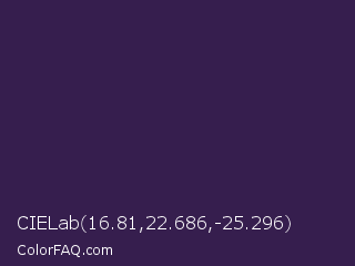 CIELab 16.81,22.686,-25.296 Color is a very dark violet color and the nearest color is Deep Grape #381a51. Hex code #361e4e and RGB value is rgb(54,30,78). In RGB color space, this color is composed of 21% red, 12% green, 31% blue, In CMYK color space, this color is composed of 31% cyan, 62% magenta, 0% yellow , 69% black , In HSL color space, this color has a hue angle of 270° , 44% saturation and 21% lightness.