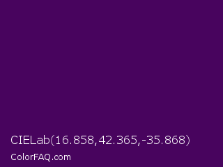 CIELab 16.858,42.365,-35.868 Color is a very dark purple color and the nearest color is Clairvoyant #480656. Hex code #48045e and RGB value is rgb(72,4,94). In RGB color space, this color is composed of 28% red, 2% green, 37% blue, In CMYK color space, this color is composed of 23% cyan, 96% magenta, 0% yellow , 63% black , In HSL color space, this color has a hue angle of 285° , 92% saturation and 19% lightness.