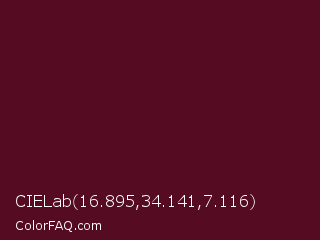CIELab 16.895,34.141,7.116 Color is a very dark rose color and the nearest color is Maroon Oak #520c17. Hex code #550b21 and RGB value is rgb(85,11,33). In RGB color space, this color is composed of 33% red, 4% green, 13% blue, In CMYK color space, this color is composed of 0% cyan, 87% magenta, 61% yellow , 67% black , In HSL color space, this color has a hue angle of 342° , 77% saturation and 19% lightness.