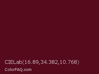 CIELab 16.89,34.382,10.768 Color is a very dark red color and the nearest color is Maroon Oak #520c17. Hex code #560a1c and RGB value is rgb(86,10,28). In RGB color space, this color is composed of 34% red, 4% green, 11% blue, In CMYK color space, this color is composed of 0% cyan, 88% magenta, 67% yellow , 66% black , In HSL color space, this color has a hue angle of 346° , 79% saturation and 19% lightness.