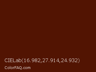 CIELab 16.982,27.914,24.932 Color is a very dark red color and the nearest color is French Puce #4e1609. Hex code #521402 and RGB value is rgb(82,20,2). In RGB color space, this color is composed of 32% red, 8% green, 1% blue, In CMYK color space, this color is composed of 0% cyan, 76% magenta, 98% yellow , 68% black , In HSL color space, this color has a hue angle of 14° , 95% saturation and 16% lightness.