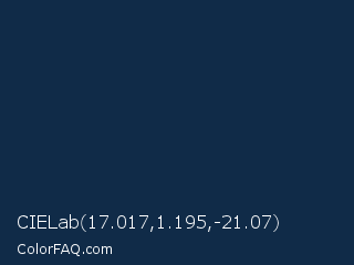 CIELab 17.017,1.195,-21.07 Color is a very dark blue color and the nearest color is Blue Zodiac #13264d. Hex code #102b48 and RGB value is rgb(16,43,72). In RGB color space, this color is composed of 6% red, 17% green, 28% blue, In CMYK color space, this color is composed of 78% cyan, 40% magenta, 0% yellow , 72% black , In HSL color space, this color has a hue angle of 211° , 64% saturation and 17% lightness.