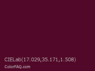 CIELab 17.029,35.171,1.508 Color is a very dark rose color and the nearest color is Castro #52001f. Hex code #550a29 and RGB value is rgb(85,10,41). In RGB color space, this color is composed of 33% red, 4% green, 16% blue, In CMYK color space, this color is composed of 0% cyan, 88% magenta, 52% yellow , 67% black , In HSL color space, this color has a hue angle of 335° , 79% saturation and 19% lightness.