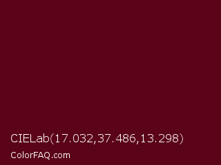 CIELab 17.032,37.486,13.298 Color is a very dark red color and the nearest color is Dark Scarlet #560319. Hex code #5a0319 and RGB value is rgb(90,3,25). In RGB color space, this color is composed of 35% red, 1% green, 10% blue, In CMYK color space, this color is composed of 0% cyan, 97% magenta, 72% yellow , 65% black , In HSL color space, this color has a hue angle of 345° , 94% saturation and 18% lightness.