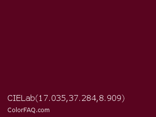 CIELab 17.035,37.284,8.909 Color is a very dark rose color and the nearest color is Bordeaux #5c0120. Hex code #59041f and RGB value is rgb(89,4,31). In RGB color space, this color is composed of 35% red, 2% green, 12% blue, In CMYK color space, this color is composed of 0% cyan, 96% magenta, 65% yellow , 65% black , In HSL color space, this color has a hue angle of 341° , 91% saturation and 18% lightness.