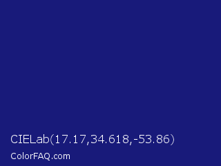 CIELab 17.17,34.618,-53.86 Color is a dark blue color and the nearest color is Deep Koamaru #1b127b. Hex code #181a7a and RGB value is rgb(24,26,122). In RGB color space, this color is composed of 9% red, 10% green, 48% blue, In CMYK color space, this color is composed of 80% cyan, 79% magenta, 0% yellow , 52% black , In HSL color space, this color has a hue angle of 239° , 67% saturation and 29% lightness.