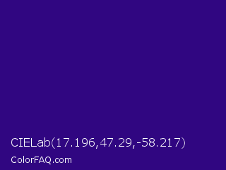 CIELab 17.196,47.29,-58.217 Color is a dark indigo color and the nearest color is Persian Indigo #32127a. Hex code #300681 and RGB value is rgb(48,6,129). In RGB color space, this color is composed of 19% red, 2% green, 51% blue, In CMYK color space, this color is composed of 63% cyan, 95% magenta, 0% yellow , 49% black , In HSL color space, this color has a hue angle of 260° , 91% saturation and 26% lightness.